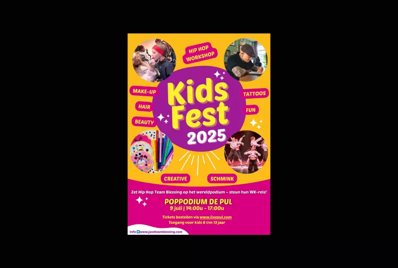 Hiphopgroep BLESSING organiseert in De Pul KIDSFEST! Ben jij tussen de 6 en 13 jaar en klaar voor een dag vol plezier? Kom dan naar Kidsfest in De Pul – hét event waar alles draait om muziek, dans, beauty, make-up, belevenis én fun! Doe mee aan een supervette hiphop workshop van JAVD dance, laat je nagels knallen met kleur, leef je uit met coole kapsels, relaxte massages én zet een stoere (nep)tattoo! ✨ Voor alle knutselaars is er ook een gezellige knutselhoek✂️